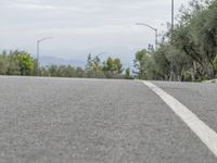 This is an image of a gloomy day with a grey sky. The focus of the photo is on the asphalt road and parking area. The low grass and trees line the open space, giving a mild sense of gloom. The image captures the infrastructure of the road surface and highway, as well as the lane markings. In the distance, there is a parking deck or garage. The photo has a gloomy atmosphere, which is enhanced by the cloudy sky. This image can be used to represent a variety of themes, from urban landscapes to transportation and infrastructure.