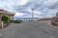 An early morning scene by the coast with a gloomy grey sky. A road surface leads to a jetty with a restaurant. Vegetation and street lights add to the coastal landscape.