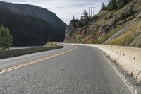 A gloomy landscape in British Columbia, Canada. A mountain road winds along the coast, with grey skies overhead. The road surface is asphalt and slopes down towards the ocean. Vegetation lines the roadside, and a guard rail and Armco barriers provide safety. Located near Lillooet.