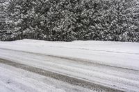 A snow-covered road in Ontario, Canada, surrounded by a gloomy landscape. The grey sky adds to the gloominess. Trees are seen in the distance. A truck is parked on the side of the road.