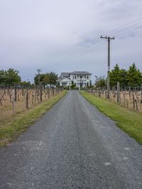 This is an image of a gloomy rural landscape. The photo is taken from a straight down the road perspective, showing the road surface and the surrounding vegetation. The grey sky sets a somber mood, while the grass, dirt, and gravel contribute to the rural aesthetic. In the distance, there is a cluster of houses and land lots, suggesting a small community. The image captures the quiet and peaceful atmosphere of the countryside. It represents a typical day in a rural area, where nature and agriculture coexist.