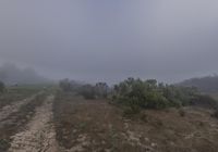 A foggy morning in the open spaces of rural California. The grey sky casts a gloomy atmosphere over the rugged landscape. A dirt road cuts through the vegetation, leading into the mist-covered forest.