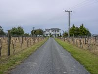 This is an image of a gloomy landscape at dusk. The picture shows a straight road leading through an overgrown vineyard with homes in the background. The grey sky adds to the somber atmosphere of the scene. The road surface is made up of gravel and dirt, surrounded by vegetation and grass. The image captures a rural setting with a sense of tranquility and a touch of mystery. This photo represents the beauty of rural life and the connection between nature and human habitation.