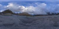 A gloomy day in the mountains of Austria. Grey skies and fluffy white clouds cover the landscape, creating a sense of gloom. The open space is surrounded by gravel surfaces and dirt, showcasing the raw beauty of nature.