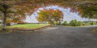 the road curves through a park with many trees in full bloom and leaves on the ground