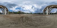 a mirror image with a view of an old road construction site with the sky in the background