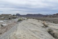 This is a stunning image of the desert landscape in Utah, USA. The red rock formation of the San Rafael Swell creates a rugged and rugged terrain. The open space is filled with sand, dirt, and gravel, creating a surface that is perfect for off-road tracks. The gloomy grey sky provides a dramatic backdrop to the bedrock outcrops and canyons of the area. In the distance, the unique formation of Goblin Valley can be seen. This photo captures the natural beauty and geology of the Badlands in Utah.
