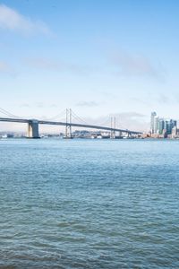 This stunning stock photo features a large body of water with a magnificent view of a coastal city skyline on a bright and sunny day. The cityscape is surrounded by beautiful buildings, and the Golden Gate Bridge can be seen in the distance. The clear blue sky with fluffy clouds adds to the picturesque setting. Perfect for illustrating urban life, coastal cities, and the beauty of a sunny day.
