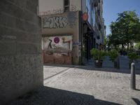This stock photo features a building in Berlin, Germany, covered in graffiti and signs. The building is located in a city neighborhood, next to a sidewalk with no cars. The surrounding area has cobblestone roads and classic architecture. It is a sunny day with clear skies, casting shadows on the building facade. The street is an alley-way, with a public space and shops nearby. The building has a unique and artistic appearance, representing the vibrant art district of Berlin.