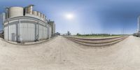 A fisheye view of an empty industrial area in Grand Rapids, Iowa. Train tracks and buildings dominate the landscape. Concrete and asphalt roads line the area, while clear skies add a touch of serenity. A glimpse into the heart of urban America.
