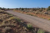 This image showcases the rugged and elevated landscape of Lock Hart Road in Utah, USA. The picture captures the natural beauty of the desert with red rock formations, canyons, and mountains in the background. The road itself is made of dirt and gravel, surrounded by shrubs, grass, and vegetation. The clear sky above adds to the picturesque scenery. Lock Hart Road provides access to the stunning Canyonlands National Park. It is a perfect destination for nature enthusiasts and adventure seekers looking to explore the high plains and unique land lots in this natural environment.