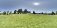 a panoramic picture of a home sits in a grassy field with trees and other houses