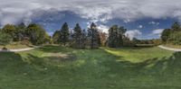 this is a photograph of a large grass park with trees in the background and clouds over the park