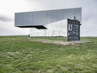 a glass structure with wind turbines behind it, on a grassy hill in front of gray building