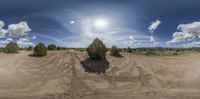 this is a 360 - image of dirt road in the desert with a few clouds in the sky