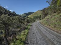 A scenic view of a gravel road winding through lush green mountains. The road surface is covered with gravel, surrounded by vibrant grass and vegetation. Blue skies in the distance complete the picturesque landscape.