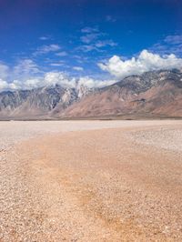 Rugged off-road track through a desert landscape, surrounded by mountain ranges. The plain is covered in dirt and pebble stones. Clouds hover above, adding drama to the horizon. A destination for adventure seekers.