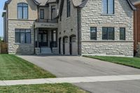 This stock photo features a gray brick house on the corner of a sidewalk in Toronto, Canada. The house is surrounded by a grassy lawn and is situated in a peaceful suburban neighborhood. The property has a well-maintained facade and a stone wall that adds to its charm. A driveway and a parking garage are visible in front of the house, making it convenient for residents. The clear sky and the well-paved asphalt road in the foreground create a pleasant atmosphere. This image is perfect for illustrating residential areas, real estate, and suburban living in Toronto.