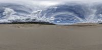 The Great Sand Dunes National Park in Colorado offers a stunning desert landscape. The open space is dominated by massive sand dunes, contrasting with the gloomy grey sky and surrounding mountains. A mesmerizing display of nature's beauty.