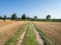 A picturesque rural landscape in Germany. Lush green fields and a clear sky create a serene atmosphere. The agriculture scene is dotted with round bales of straw, showcasing the harvest season.