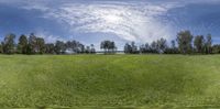 a 360 - view shows trees in a green field with a big hole and some clouds above them
