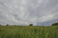 A vast open space of lush green grass surface with scattered bushes. The gloomy grey sky creates a moody atmosphere. Incidental people can be seen on the horizon. An idyllic landscape for agriculture or land lot development.