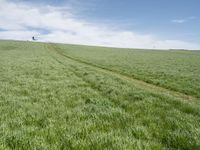 This stock photo features a picturesque landscape in rural Germany. With a clear sky overhead, a green hill covered in lush grass is dotted with fields and agricultural paths. On the top of the hill stands a lone tree, adding a touch of serenity to the scene. The vibrant green hues of nature create a beautiful and tranquil ambiance, perfect for any project or design.