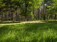 a forest with some green grass near dirt road and trees on the other side and bushes all around it