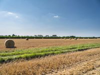 This image captures the beauty of a rural landscape in Germany. The green field is filled with round bales of straw, indicating a successful harvest. The lush grass extends as far as the eye can see, emphasizing the vastness of the agricultural land. Above, the clear sky with its bright blue color adds a touch of serenity to the scene. This photo represents a peaceful day in the European countryside, showcasing the harmonious coexistence of nature and agriculture.