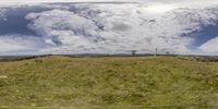 A dramatic landscape featuring a green mountain slope under an ominous cloud formation. The grassy hill and open space highlight the natural beauty of the terrain. A gloomy sky adds to the dramatic effect.