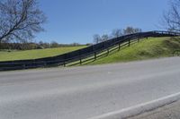 This image shows a scenic rural landscape in Ontario, Canada. The lush green vegetation and trees line the road surface that leads to an entry driveway of a farm. Located in the outskirts of Toronto, this picturesque view showcases the beautiful countryside of Ontario. The vibrant green grass and agricultural land lots create a peaceful and serene atmosphere. In the distance, a fence, Armco barrier, and guard rail can be seen, ensuring safety along the road. The clear sky and fluffy clouds add to the overall beauty of this day in the countryside of Ontario, Canada.