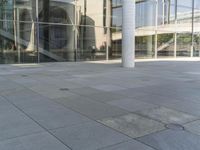 This image captures a modern urban landscape in Berlin, Germany. The photo showcases a business district with sleek architecture and an empty sidewalk. The large building in the foreground features a glass facade, allowing natural light to stream in. The grey surface of the asphalt road contrasts with the contemporary design of the building. The photo highlights the open space and urban design of the area. This scene represents the dynamic and innovative nature of Berlin's architecture and business environment.