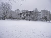 This is a black-and-white image of a snowy winter day in a city park. The landscape is blanketed with snow, with a line of snowy trees in the background. The scene is peaceful and serene, with the snow-covered branches and twigs adding to the winter ambiance. Through the window of a building, you can catch a glimpse of the snowy scenery outside. This photo captures the beauty and tranquility of a winter day in the city.