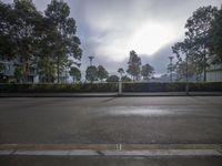 A gloomy day in the suburban business district. Grey skies and fog surround office buildings. Sunlight peeks through clouds, casting shadows on the road. The park nearby is lined with trees.