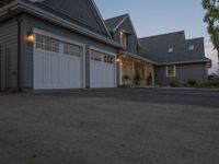 This stock photo features a grey three-car garage with the lights on, located in a suburban area of the USA. The classic architecture of the building adds charm to the overall scene. The garage door and windows, surrounded by vegetation and trees, stand out against the clear sky at dawn. The asphalt road surface and driveway provide easy access to the property. This image captures the beauty of a residential home, showcasing the suburban lifestyle with artificial light illuminating the entryway.