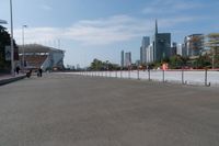 A clear sky overlooks the cityscape of Guangzhou, China. The asphalt surface reflects the urban skyline, creating an open space in the bustling city of Guangdong. A picturesque day in the heart of the city.