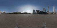 A futuristic skyline of Guangzhou, China, with modern architecture and elevated glass walls. The cityscape offers a clear sky and an open space. Contrails form low in the sky. A skateboarder glides on a concrete surface, surrounded by greenery.