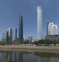 A breathtaking cityscape of Guangzhou, China. The modern architecture and high-rise skyscrapers reflect in the calm waters. The clear sky highlights the futuristic architecture of this vibrant metropolis in Asia.