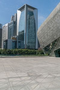 A man skateboarding in an open square in Guangzhou, China. Futuristic architecture dominates the cityscape, contrasting with the clear sky. The modern concrete surfaces and pavers enhance the urban atmosphere.