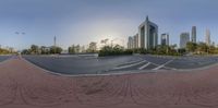 A fisheye lens captures the vibrant cityscape of Guangzhou, China. The clear sky reflects on the circular mirror frame, creating a unique perspective. Lush greenery and colorful flowers add a touch of natural beauty to the urban scene.