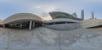 Aerial view of a futuristic building in Guangzhou, China. The modern architecture stands tall against the clear sky. The cityscape below showcases a combination of concrete surfaces, glass walls, and greenery. A top-down perspective reveals an open space with a stone floor and pillars.