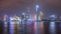 A futuristic cityscape in Guangzhou, China with a modern skyline and neon lights illuminating the coastal harbor. Streetlights and roadways guide the way along the river, creating a vibrant and lively atmosphere.