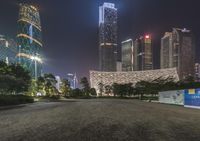 Nighttime in Guangzhou's business district. Modern skyscrapers and futuristic architecture illuminate the cityscape. Open plazas and courtyards offer a glimpse of urban design. Neon lights and artificial illumination create a vibrant city life.