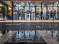 A rainy night in Guangzhou's business district showcases the city's modern architecture. Neon lights reflect off the wet road surface as people dine in bustling restaurants and cafes. The city's vibrant nightlife is reflected in the glass facades of office buildings.