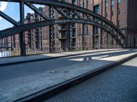 This is a photograph of the Speicherstadt area in Hamburg, Germany. The image showcases the classic architecture of the warehouses, built with brick and wood, along the waterfront. The reflection of the buildings can be seen on the calm water surface. A road and a tied-arch bridge lead to the area, surrounded by trees and other vegetation. The urban design of the city creates a symmetrical and picturesque view. The clear sky adds to the vibrant city life in Hamburg, showcasing the beauty of European architecture. This photo captures the essence of Hamburg's urban landscape.