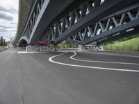 A modern architecture cityscape in Hamburg, Germany. The image features a road with asphalt surface, bridges, and underpasses. The open spaces are adorned with graffiti, adding an urban touch to the urban design. The cloudy sky adds a dramatic backdrop.