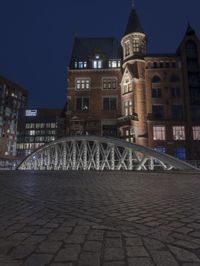 Classic architecture in Hamburg, Germany. The large brick building stands alongside a brick road and is illuminated by lights under a bridge. The scene captures the charm of Speicherstadt at night.