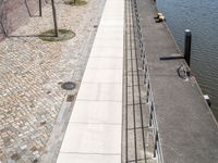 some people are walking along a path beside water and buildings with brick walls and plants in the foreground