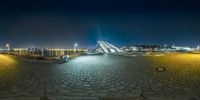 a 360 lens photograph of the walkway and plaza at night with light reflecting on the sidewalk