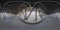 a fisheye shot of a street with a bridge in the background under a very high angle bridge